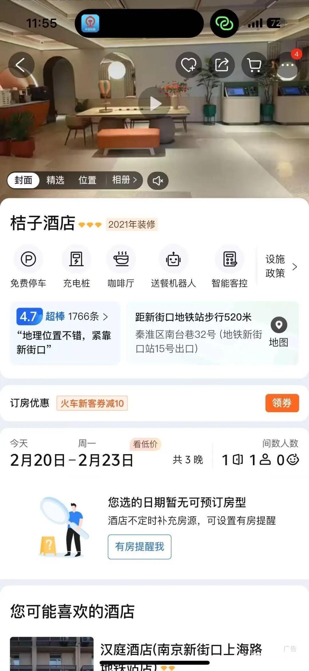 2月20日,南都湾财社记者在携程、去哪儿、美团等多个OTA平台查询均发现,无法直接搜索到涉事酒店,但通过地图App搜索则可以跳转至涉事平台涉事酒店页面,但记者换了多个日期搜索房型,页面均显示“您选的日期暂无可预订房型”。飞猪平台则能搜索到涉事酒店,但同样无法预订房间。