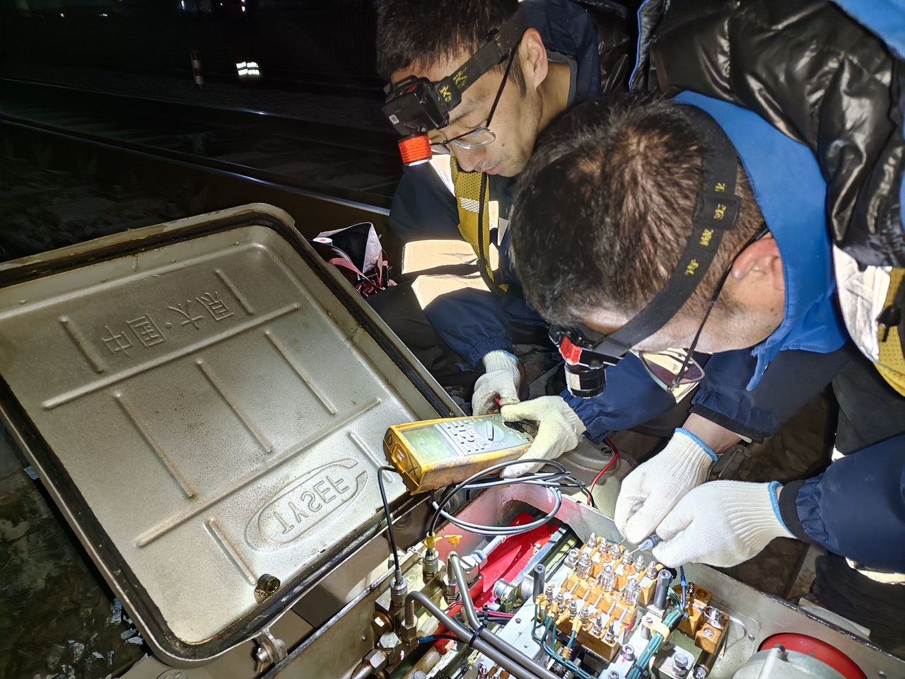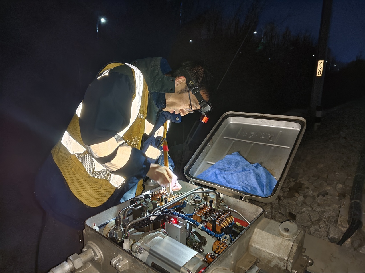 皓月当空,站场上,检查锤与钢轨的敲击声、道岔的转动声和对讲机里室内外的呼唤应答声此起彼伏。凌晨4时,最后一组道岔试验完毕,当晚的检修任务全部完成,职工们收拾好工具材料,快速撤离站场。