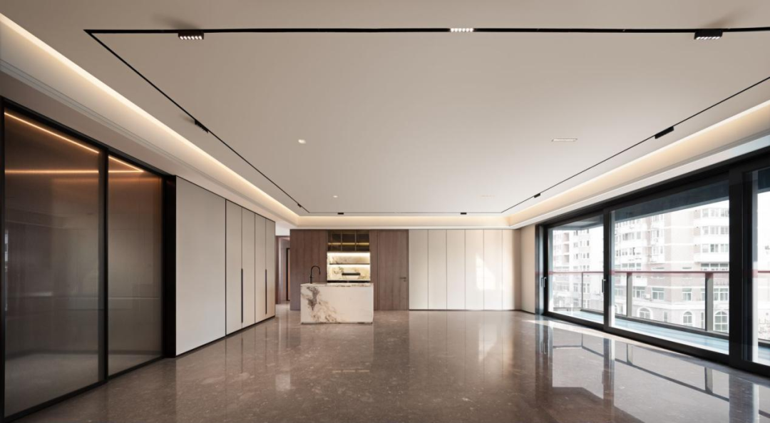 交付时墙面统一铺贴墙布、墙纸或安装护墙板,客厅及主卧采用满布吊顶,巧妙隐藏防眩灯具,阳台也同步采用木饰面吊顶。